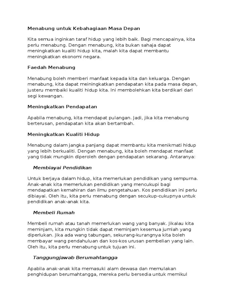 Dari kecil sehingga ke peringkat dewasa amalan menabung merupakan salah satu. Contoh karangan kepentingan amalan menabung dan menyimpan wang. Menabung merupakan amalan terpuji untuk melahirkan masyarakat yang . Amalan menabung perlu dipraktikkan dalam kehidupan untuk mewujudkan masyarakat yang berjimat cermat. Amalan menabung akan mewujudkan simpanan wang yang mampu memberi jaminan keselamatan tatkala kecemasan. Kelab kewangan sekolah akan mengurus wang simpanan saku tersebut.
